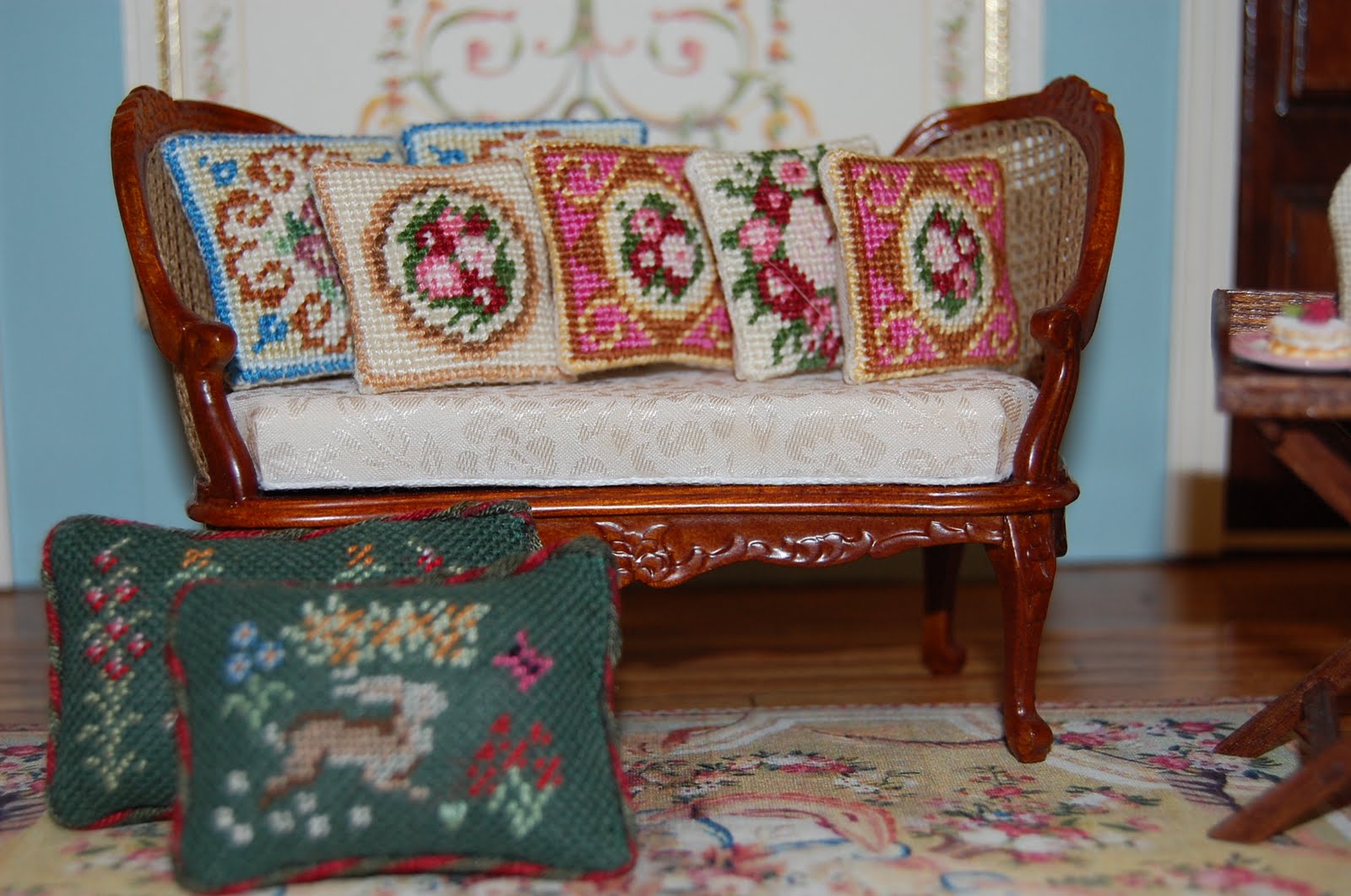 In this update I wanted to treat you to some beautiful needlework that Susan in the UK has done for me. I found her on ebay and bought some of her beautiful dollhouse needlework and was thrilled when it arrived in the post. I have since asked her to do some Janet Granger cushion kits for me and recently a tea cozy which I have always wanted. This is actually the second tea cozy she has made for me as Canada Post managed to lose the first.